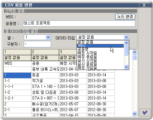 ¸¶Âù°¡Áö ¹æ¹ýÀ¸·Î 2¹ø ¿À» ¼±ÅÃÇÏ°í µ¥ÀÌÅÍ Å¸ÀÔÀ» '°øÁ¾¸í' À¸·Î, 3¹øÂ°´Â '¿¹Á¤ ÀÛ¾÷ÀÏ'·Î, 4¹øÂ°´Â '¿¹Á¤ ½ÃÀÛÀÏ', 5¹øÂ°´Â '¿¹Á¤ Á¾·áÀÏ'·Î ¼³Á¤ÇÕ´Ï´Ù. ±× ´ÙÀ½ È®ÀÎ ¹öưÀ» ´©¸£¸é µ¥ÀÌÅ͸¦ ºÒ·¯¿É´Ï´Ù.